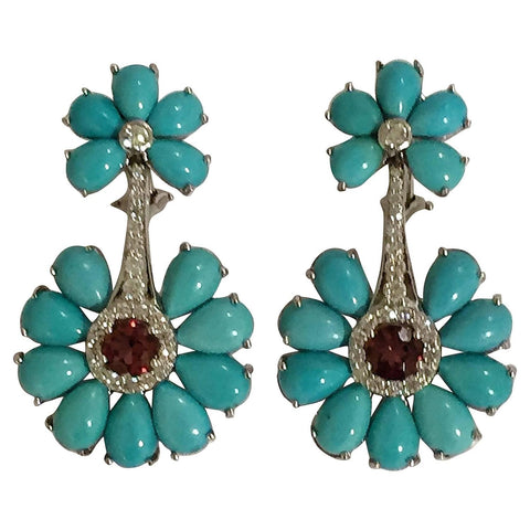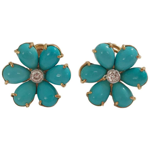 Elegant Turquoise Flower Earring is set in 18kt Yellow Gold with a Diamond Center set in Platinum.