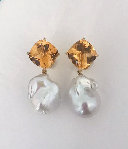18kt Yellow Gold Square Orange Citrine Stud with a Baroque Freshwater Pearl Drop Earring is a gorgeous statement piece, that is lightweight and versatile.