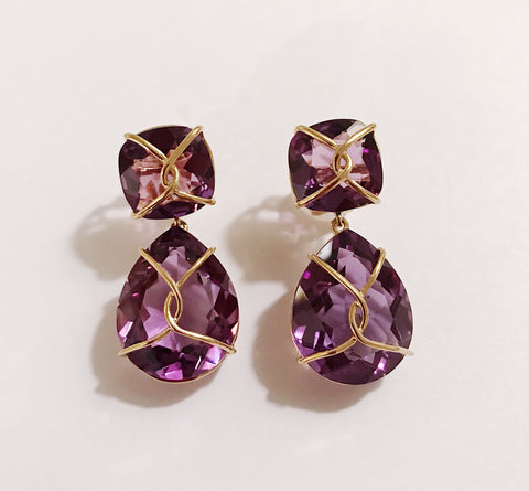 18kt Yellow Gold Drop Earring with gold wrapped faceted cushion shaped Purple Amethyst top and faceted pear-shaped Purple Amethyst.