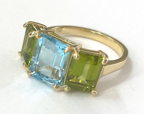 18kt Yellow Gold Mini Emerald Cut Ring with Blue Topaz and Peridot
