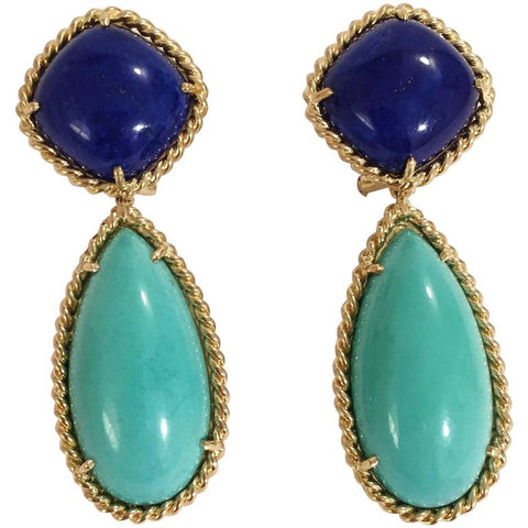 18kt Yellow Gold Large GUM DROP™ Earrings with faceted Iolite and CabochonTurquoise and diamonds.