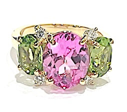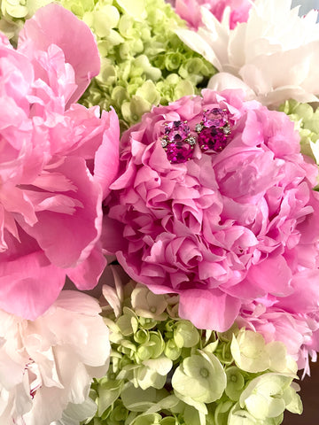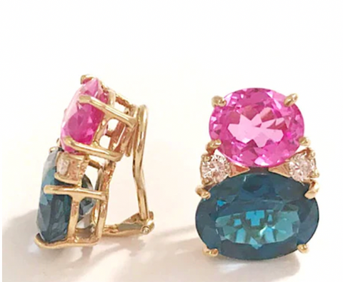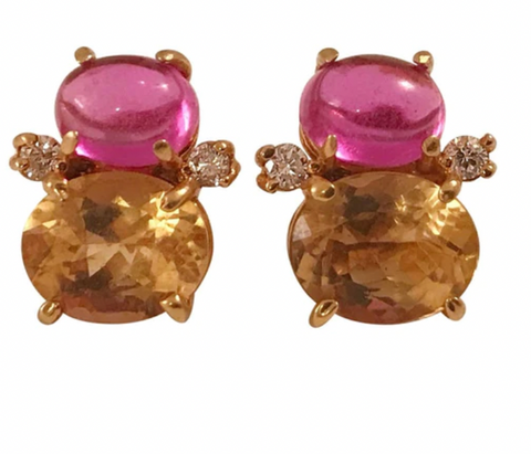 Medium 18kt yellow gold GUM DROP™ earrings with faceted Pale Pink Topaz (approximately 2.5 cts each), faceted Dark Pink Topaz (approximately 5 cts each), and 4 diamonds weighing ~0.40 cts.