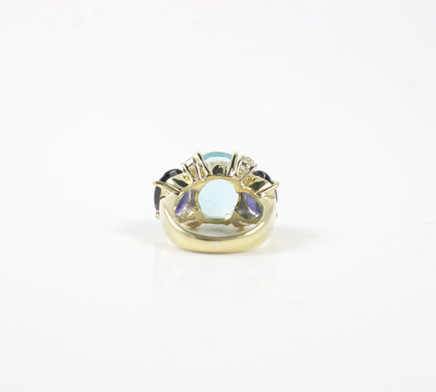 Large 18kt yellow gold GUM DROP™ ring with blue topaz (approximately 8 cts), iolite (approximately 5 cts each), and 4 diamonds weighing 0.48 cts.