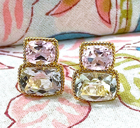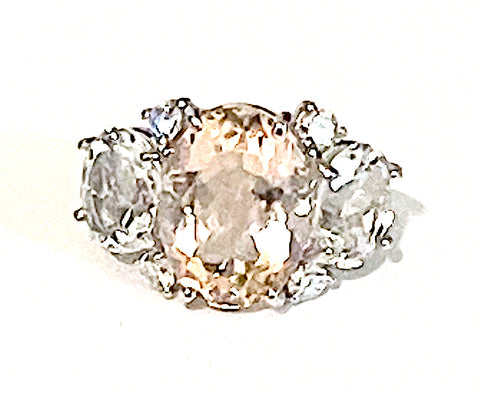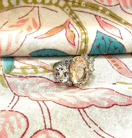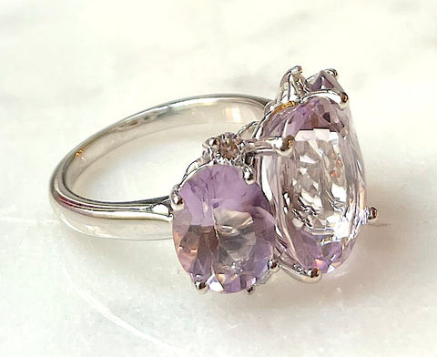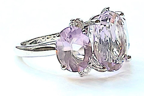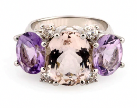 Medium 18kt White Gold Gum Drop ring with Morganite (approximately 5 cts ) and Pale Rose de France Amethyst (approximately 4 cts each), and four diamonds weighing approximately 0.48 cts.