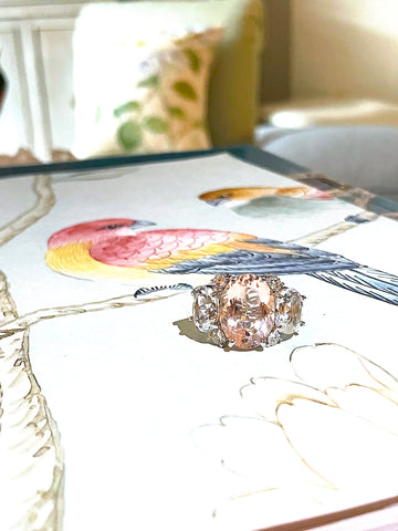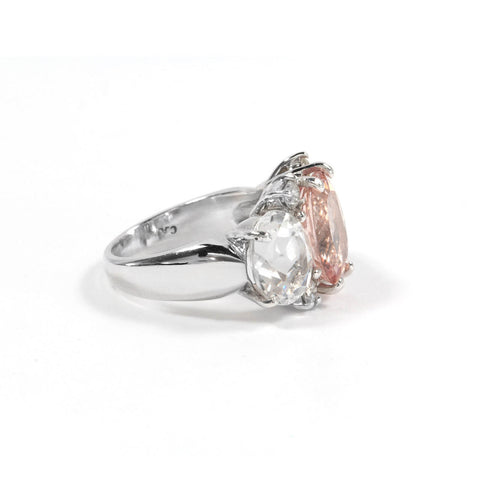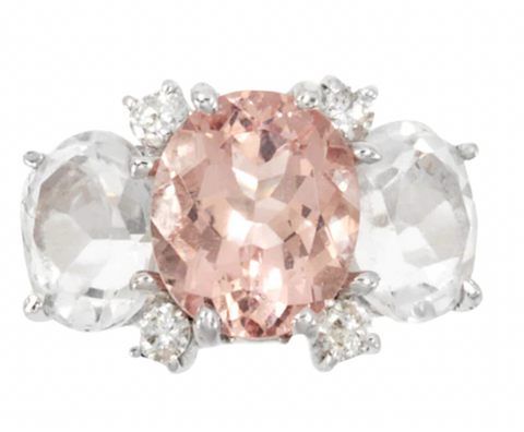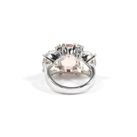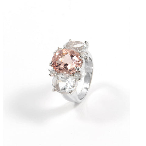Medium 18kt white gold GUM DROP™ ring with morganite (approximately 5 cts), white topaz (approximately 4 cts each), and 4 diamonds weighing 0.48 cts.