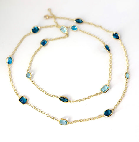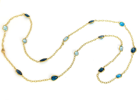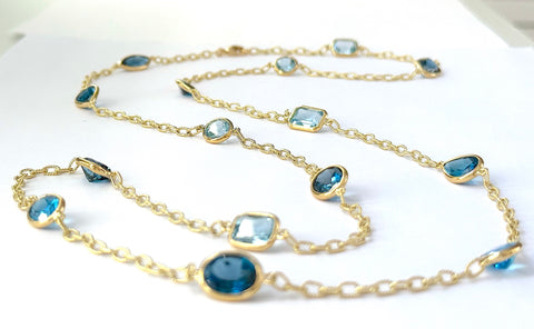 18kt Bespoke Multi Shaped Blue Topaz stones of varying shades set along an elegant twisted link chain.