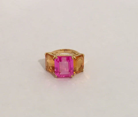 18k Yellow Gold Three Stone Emerald Cut Ring with Citrine and Pink Topaz