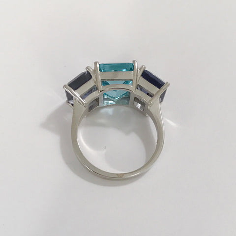 18kt White Gold Three Stone Emerald Cut Ring with Blue Topaz and Iolite