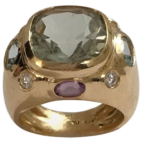 18kt Yellow Gold BONHEUR Domed Ring with faceted cushion cut Citrine center stone and faceted oval Peridots and round Diamonds.