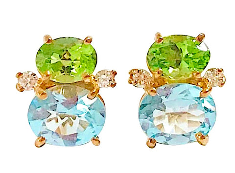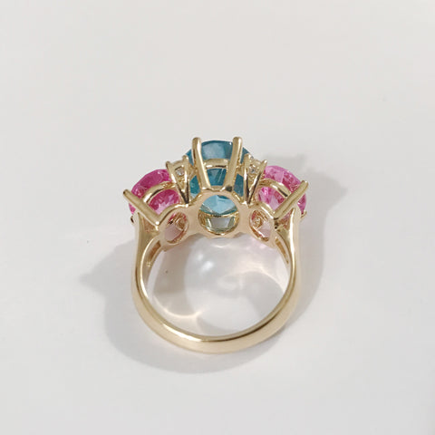 18kt Yellow Gold Medium GUM DROP™ Ring with faceted oval shaped center Blue Topaz and two oval faceted Pink Topaz and four round Diamonds ~0.50cts