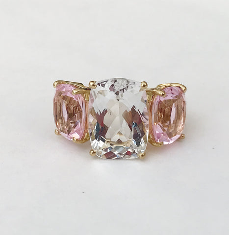 Rock Crystal and Pink Topaz Yellow Gold Three-Stone Cushion Ring