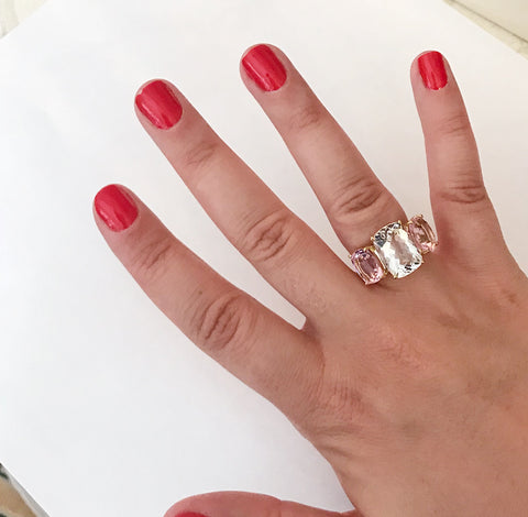 18kt Rose Gold Three Stone faceted Cushion Ring with center Rock Crystal and two Pale Pink Topaz finished with a tapered split shank. This elegant cocktail ring measures 1 1/4" across the top.