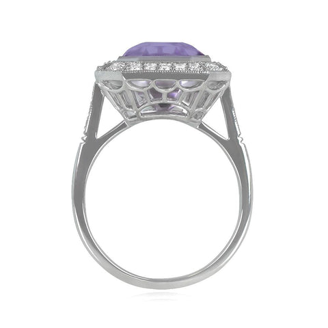 This sapphire halo ring features a 4.91-carat antique cushion cut diamond, L color, and VS2 clarity. The center diamond is bezel-set and accented by a halo of French-cut natural sapphires. The total sapphire weight is 0.90 carats. Approximately 0.12 carats of old European cut diamonds are set along the shoulders. This ring is handcrafted in platinum, and decorated with an openwork under-gallery and fine milgrain.